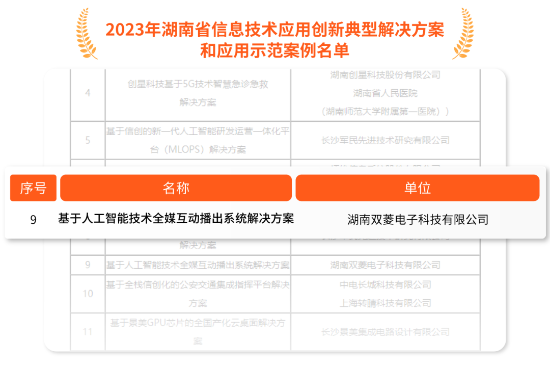 湖南双菱电子科技有限公司“基于人工智能技术全媒互动播出系统尊龙凯时ag旗舰的解决方案”荣获2023年湖南省信息技术应用创新典型尊龙凯时ag旗舰的解决方案。