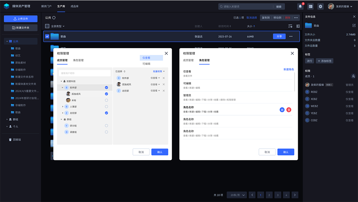 支持多级文件夹嵌套,赋予每个成员不同角色权限,可按部门对资源和权限进行空间分配,