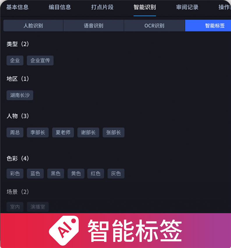 智能识别类型、场景、机构、人物等多维度标签,可满足不同场景下的资源编目需要。